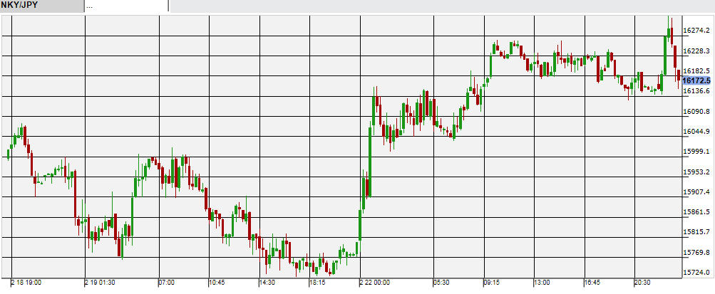 前日のNY株式市場がやや下落して終了したため、22日の国内株式市場では日経225平均が15,851円と安く寄り付いてスタート。朝方に特別な材料は出なかったものの、午前10時までに先物主導と思われる急上昇を見せた。結局この日はそのまま16,100円台の高値圏で推移し、終値は16,111円だった。夕方以降の先物は円安と欧米株高に合わせ、小幅上昇したのみ。