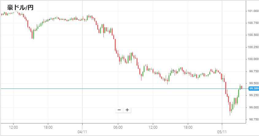 豪中銀が4日午後12時半に政策金利を発表し、予想通り3.6%のまま据え置きだった。また同時に発表された声明では「最近インフレが加速している」とインフレ警戒の文言があった。朝方には1豪ドル=100円80銭だった豪ドル/円は、午前中の片山財務相の円安けん制発言でその後円高・豪ドル安が進行。政策金利発表と声明の内容は織り込み済で相場に影響はなく、午後から夕方にかけて引き続き円高が進行して5日未明には99円台後半で落ち着いた。