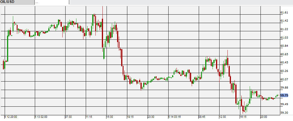 前日に米エネルギー情報局(EIA)が発表した週間原油在庫は、予想の前週比38万6000バレル増に対して発表は220万バレル減だった。前週より減ったものの、米の供給過剰感はまだ根強く残っている。また国際エネルギー機関(EIA)が世界の原油供給圧力が増していると述べたこともあり、ここ最近の上昇が一服して反落。60ドルを割って59ドル台まで後退した。