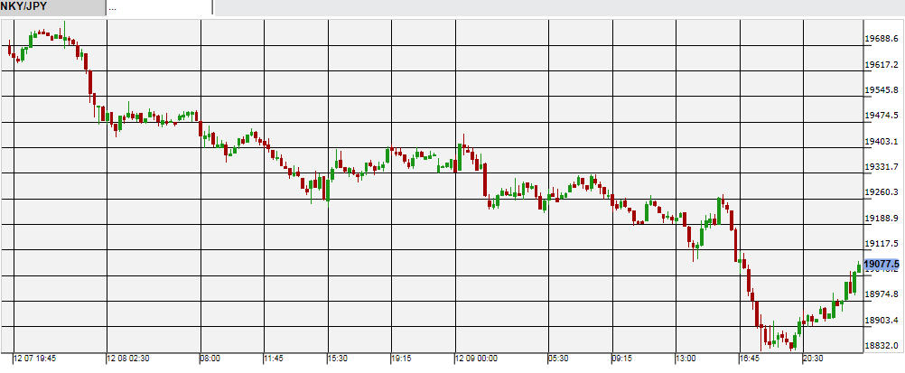 低調な中国の経済指標、前日のNY株式市場の下げ、そして原油安などから、国内株式市場は軟調な展開が続いている。19,391円と前日より約100円安い水準で寄り付いた9日の日経225平均は、場中も下げて終値は19,301円だった。夕方以降の先物の時間になると、欧米の株式市場が下げたことを受けて日経225先物が下落。10日未明には一時19,000円割れも見せた。