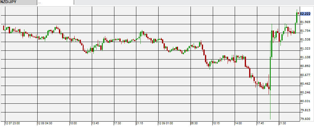 10日午前5時に、NZ中銀が政策金利を発表。事前予想通り、これまでの2.75%から0.25%利下げして2.5%にされた。政策金利は引き下げられたが、同時に発表された声明で「現行の金利設定でインフレ目標到達を予想」と述べられていた。この声明は今後の追加利下げを否定するものであり、それを受けて発表後にNZドルが上昇。NZドル/円は発表前の80円台前半から81円台後半に上がった。