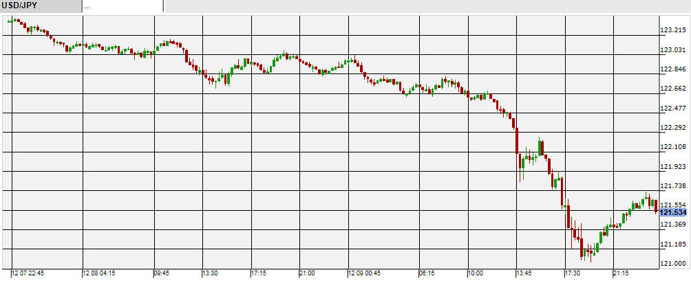 世界景気への懸念が高まったため、9日から10日にかけてリスク回避の円買いが急進行。9日日中から夕方にかけて122円台後半であまり動きのなかった米ドル/円だが、NY時間になってから円高・米ドル安が急進。10日未明には約1ヶ月ぶりとなる121円台をつけ、さらに121円に近づくところまで下落した。