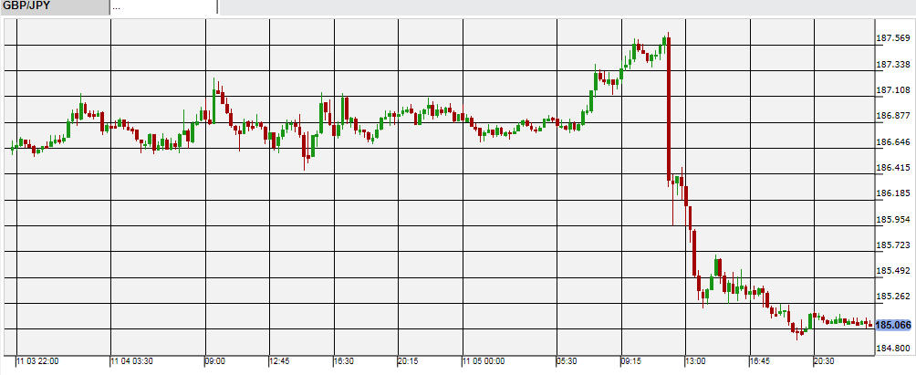 昨夜9時に英BOEが金融政策を発表。政策金利・資産購入プログラムともに現状維持とされた。しかし同時に発表したインフレレポートで、2016・17年の成長率見通しを引き下げ。さらに利上げの予想時期も「2017年第1四半期」とこれまでより先送りさせたため、発表後にポンドが急落。発表前に187円50銭付近にあったポンド/円は、6日朝までに185円にまで下げた。