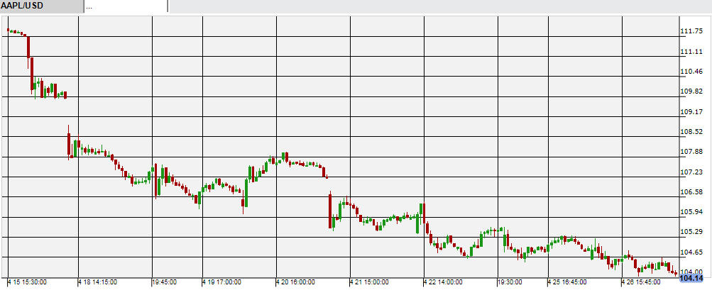 Appleは26日に1~3月期決算を発表。今期の売上高は505億ドルとなり、前年同期比13%の減収だった。Appleの減収は13年ぶりとなるが、これは主力商品であるiPhoneの売上が頭打ちになっていることが大きい。決算は低調だったものの発表が市場終了後だったので、この日の株価はそれほど下がらず前日比0.7%安の104.35ドルで終了した。