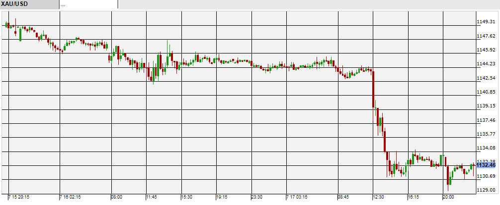 米景気の堅調さと利上げ期待からここ最近は下落が続いているNY金だが、17日も好調な米経済指標を受けて続落。発表された指標の1つ、6月住宅着工件数は予想の110万6000件に対して発表は117万4000件だった。この発表後に金は急落し週末前に1,130ドル付近に。週明け20日には1,130ドルを割り、2010年春以来約5年ぶりの安値に落ち込んだ。