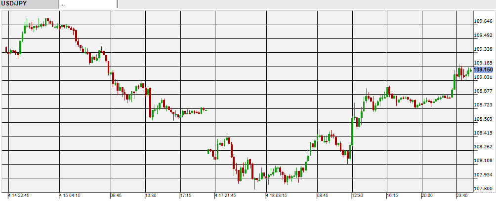 週明けの米ドル/円は、原油安や地震の影響からリスク回避の円買いが広まり日中はまた107円台をつけた。しかし午後以降になると欧米株式市場が下がらなかったことから円安地合に転換。夜9時前後には特に大きく円安になり、19日未明までには108円台後半まで上昇した。