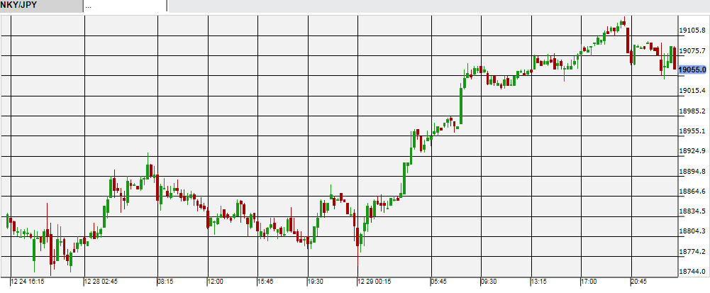 29日の国内株式市場は、材料難ではあったが年明けの上昇が期待されて上昇。日経225平均の寄り付きは前日比30円安の18,843円だったものの、場中は買いが多く入り終値は100円以上高い18,982円だった。夕方以降の先物の時間になると、欧米の株式市場が上昇したために先物が早々に19,000円を回復。30日未明には常時19,000円台を推移していた。