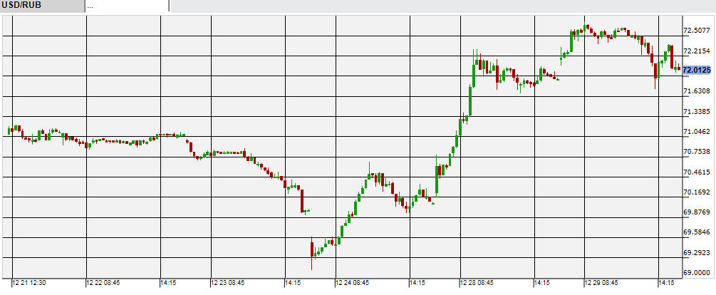 経済低迷が続いているロシアは、先週後半からルーブルが一段と下落。政府系銀行のVEBが政府に救済を要請しているためその悪材料もあり、今週になって1米ドル=72ルーブル台に下落。昨年12月の通貨危機以来の低水準で推移している。29日になってトルコに課している経済制裁の一部を解除すると報じられややルーブル高になったが、上昇幅はわずかだった。