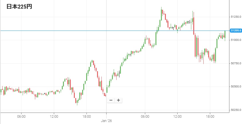 2日は新年のため東証がまだ今年の取引を始めておらず、かつ大阪の日経225先物も祝日取引は行われなかった。したがって日経225先物が取引されていたのは海外のシカゴなどの市場のみ。そして新年開始直後の2日朝方には一旦50,500円を割った先物だが、午前中から午後にかけて急上昇して51,000円を回復。夜はそのまま51,000円台を維持していたものの、3日未明にやや大きな下げがあり50,000円台後半まで後退した。