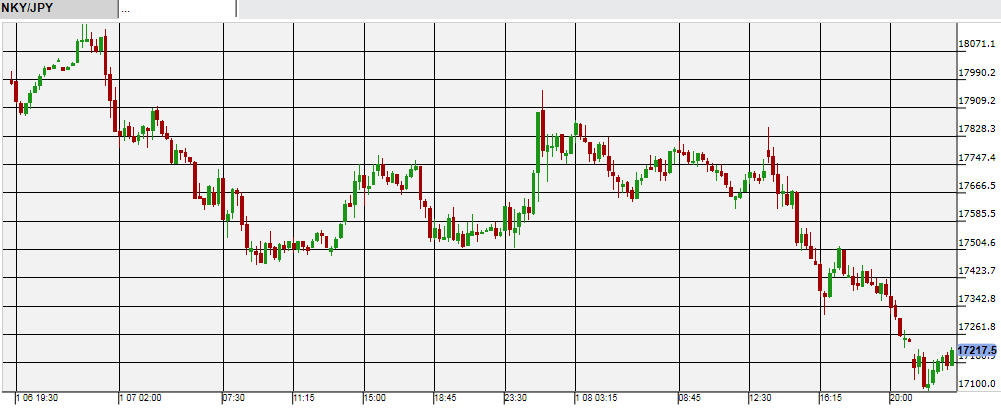 前日7日のNY株式市場が下げて終わったことから、8日の日経225平均は安く寄り付き、17,562円でのスタートとなった。その後中国株式市場が始まり一瞬下げた後落ち着いたことから、日本の株式市場も上昇。後場にはやや下げて終値は69円安の17,697円だった。しかし夕方以降の先物の時間になると、NY株式市場の下げや117円台前半までの円高進行を受けて日経225先物が大幅下落。9日朝には17,200円台で先週を終えた。