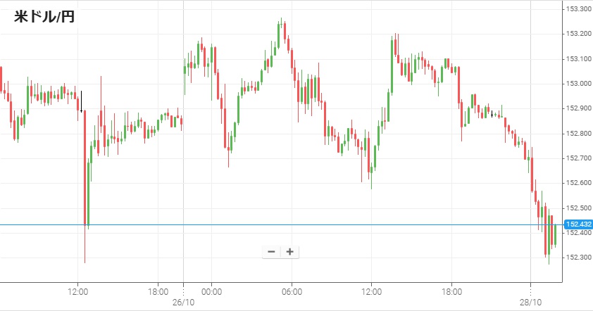 週末に米中閣僚級会談が行われ米中がお互いへの関税や輸出規制などを延期すると発表したことで、週明けの為替市場はリスク選好ムードの米ドル買いが多く入った。先週を1ドル=152円80銭で終えた米ドル/円は、月曜はやや上窓を開けて153円からスタート。日中は153円を挟んだ細かい上下が続き一時は153円20銭を超えたが、28日未明になると米ドル売りが多く出て午前中には152円50銭を割った。