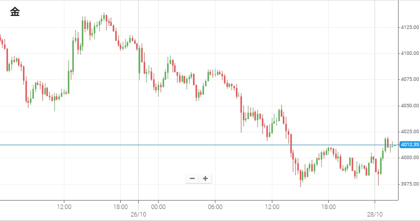金価格は9月から10月前半にかけて急上昇し何度も最高値を更新したが、10月中旬に4,300ドルを超えた後は高値警戒感から下げに転じている。そして先週末には米中が貿易問題で合意に達し両国の緊張緩和が見えたことが、週明け27日の金相場にとって売り材料となった。4,100ドル付近から今週をスタートしたNY金は、日中から売られて夜には約20日ぶりに4,000ドルを割って3,900ドル台をつけた。その後28日未明になると4,000ドルを挟んだ上下が続いた。