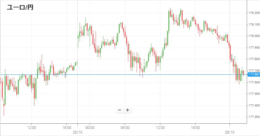 すでに述べたように週末に米中閣僚級会談が行われ、米が対中100%関税を、中国がレアアース輸出規制をそれぞれ延期することで合意した。この緊張緩和によって週明けのユーロ/円は上窓を開けて始まり、1ユーロ=178円を超えて2002年のユーロ発足以来の対円最高値を更新。その後日中は178円付近で上下した後、午後10時頃には178円20銭まで上昇して再度最高値を更新した。