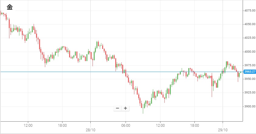 9月から10月前半にかけて急上昇して一時は4,300ドルを超えた金だが、その後は高値警戒感などから下げに転じている。そして先週末に米中閣僚級会談で進展があり緊張緩和が見えたため、今週の金価格は一段安となっている。28日朝方には4,000ドルだったNY金は、午前中から午後にかけて売られて夕方には一時3,800ドル台に。しかしそこで下げ止まって夜は反発し、29日未明には3,950ドル付近に留まった。
