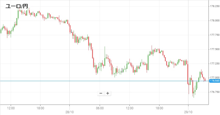 ユーロなど欧州系通貨は対円での上昇が続いており、今週明け27日には1ユーロ=178円を超えてユーロ発足以来の最高値を更新した。だが28日になると上昇は一服し、朝方に178円だったレートは午前中に177円台前半まで下落。午後から夕方にかけては目立った動きがなく177円台前半に留まり、夜に多少上昇したものの29日未明までにほぼ同じ幅だけ下落。そして29日朝方には再度円高に動き177円を割っている。