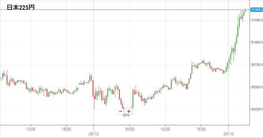 前日・27日には史上初めて50,000円を突破した日経225平均だが、一夜明けた28日も大きく下がらず50,000円台を固めた。この日は155円安の50,357円で寄り付き、前場には目立った動きがなかったが後場になるとやや下落。しかし50,000円を割ることはなく、293円安の50,219円で終了した。夕方以降の先物は夜に数百円上昇。そして29日の東京市場が始まるとまたも暴騰して51,000円を超えている。