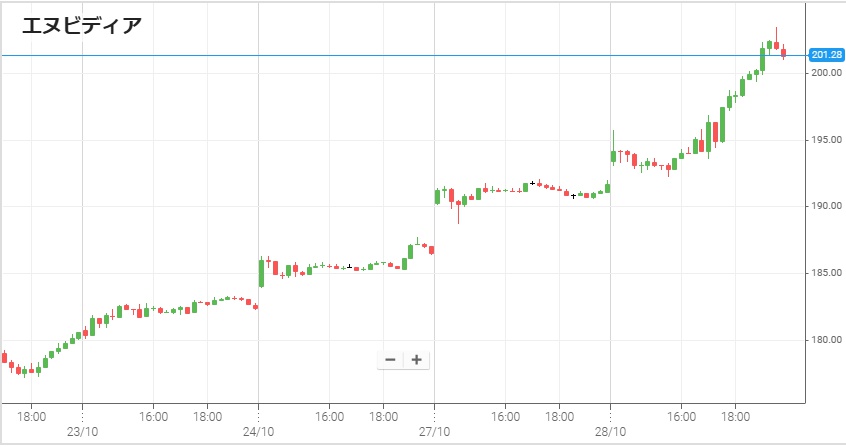 AIの普及とともに業績・株価とも爆発的に伸びているエヌビディアだが、今週になって米中の緊張緩和期待が高まったことが新たな買い材料となった。前日・27日を191.49ドルで終えた同社の株は、28日のNY株式市場前半にはあまり動かなかったが後半になって上昇。200ドルを超えて5%高の201.03ドルで終了し、時価総額は4兆9000億ドル弱になり大台の5兆ドルも見えてきた。