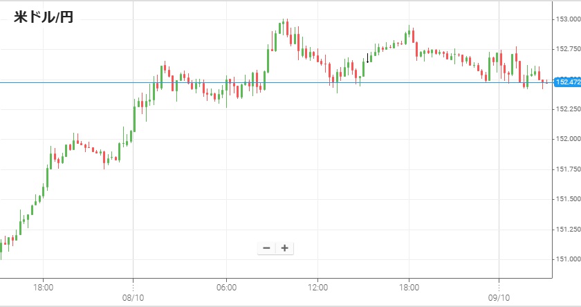 株価と同様高市総裁就任後の今週の為替市場は高市氏の政策見通しによって大きく影響され、今後の財政赤字拡大懸念から急激な円安が進行している。8日朝方には1ドル=152円だった米ドル/円は、午前中に再度円安に動き152円50銭に。午後にはあまり動かなかったものの夕方頃にまたまとまった円売りがあり、一瞬だが今年2月以来となる153円をつけた。だがそこで円売りは一旦止まり、夜から9日未明にかけて152円台後半で推移した。