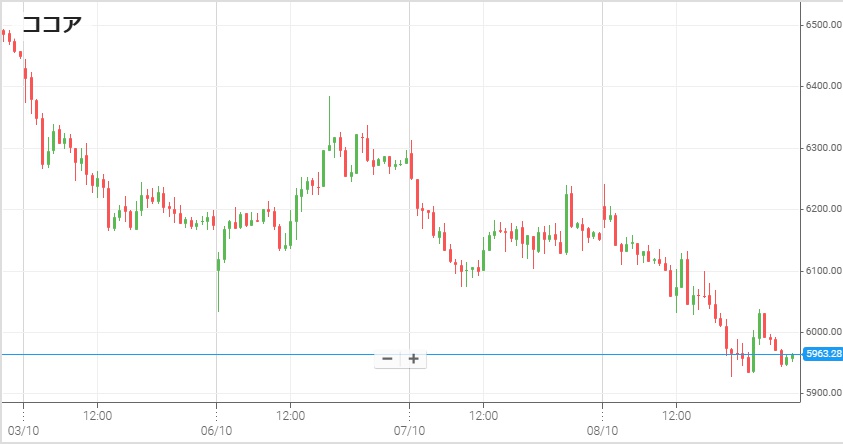 昨年から今年前半にかけて暴騰してきたココア価格だが、今年8月以降は一転して下落が続いている。最近になってガーナとコートジボワールがカカオ豆農家に対して補助金を増額すると発表したことも売り材料となり、10月になると連日の大幅下落。7日を6,150ドルで終えたNYココアは、8日も市場序盤から下落し後半には昨年2月以来初めて6,000ドルを割って5,000ドル台をつけた。