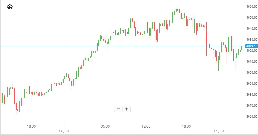 日米など各国政府の財政懸念が高まっていることや、FRBの利下げ観測が金買い材料となり8月以降金価格は急上昇している。また今月は米政府閉鎖も金価格を押し上げており、8日朝方に3,980ドルだったNY金はその後上昇して大台の4,000ドルに乗せた。午後以降も買いが続き夜には4,050ドルを超えたものの、そこで上昇は止まり9日未明には反落して朝方までに4,000ドル付近まで後退してきた。