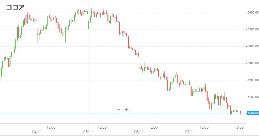 ココア価格は去年暮れに12,000ドルの史上最高値をつけたが、今年に入ってからは西アフリカの生産国で生産量が回復する見込みや、価格高騰による需要減退懸念で下げが続いている。6日を6,200ドル付近で終えたNYココアは、7日もガーナやコートジボワールにおける生産量回復見通しを受けて下落。終了間際には一時6,000ドルを割って5,900ドル台をつけた。