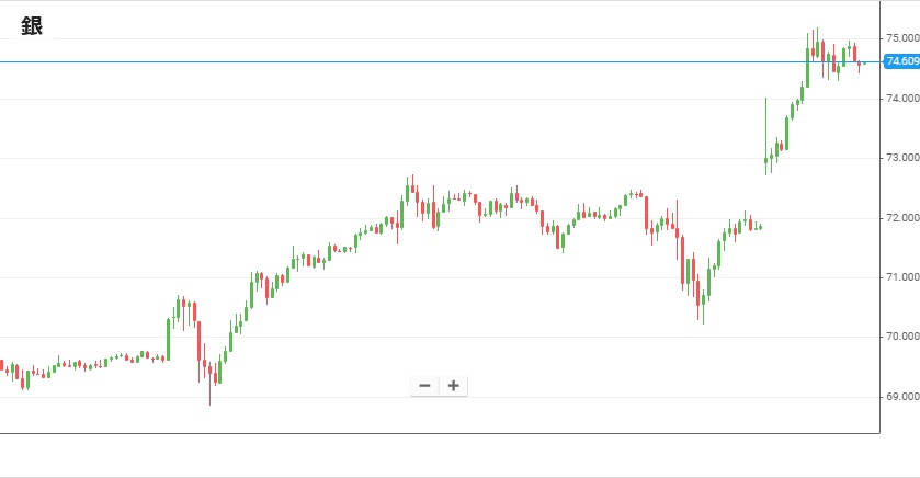 メディアでは金価格の上昇が広く報じられているが、同じ貴金属銘柄である銀も最近になって金と同様に急上昇している。銀も金と同様に今週になって特に買いが多く入り、24日朝方には72ドルをつけて最高値を更新したがその後は72ドル付近で推移したままこの日を終えた。25日が休場した後再開した26日朝方には、75ドルをつけて最高値を5%近く一気に更新した。