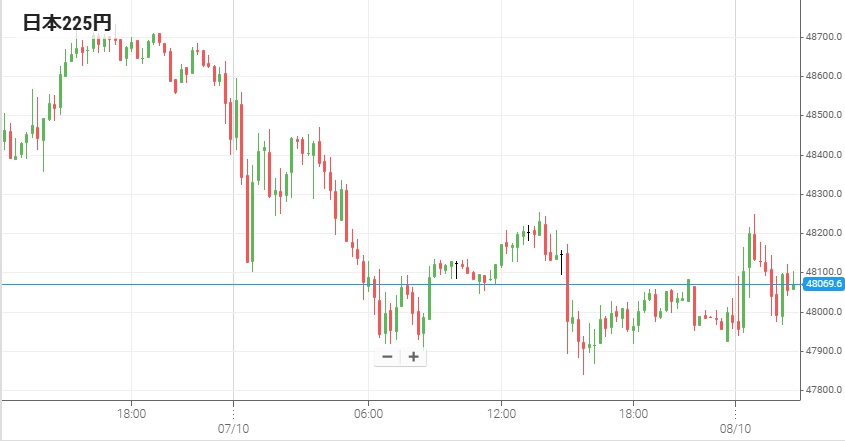 高市総裁の就任は円安材料になったが同時に株高材料となり、6日の日経225平均は歴代4位の上げ幅となる2,175円高で終了。さらに6日夕方から7日未明にかけて先物も上昇して7日朝方までに48,500円をつけた。そして7日の東証では337円高の48,281円で寄り付き、直後に48,500円を超えて史上最高値を更新。しかしその後は前場の残り時間から後場にかけて高値警戒感から売りが増え、終値は6円高の47,950円でわずかに終値の最高値を更新した。
