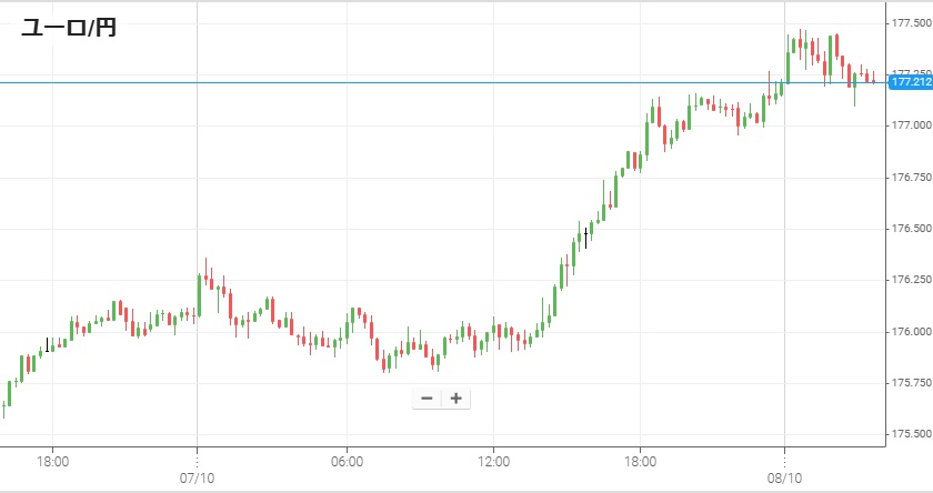 高市総裁就任後の円安は対米ドルだけではなく、多くの主要通貨に対して起こっている。ユーロ/円は7日日中は1ユーロ=176円付近であまり動かなかったものの、ECBラガルド総裁が8日午前1時頃から行われた講演でユーロの地位向上に言及したことを材料にその後上昇。午前3時過ぎには177円を超えて対円の史上最高値を更新し、さらに午前中には177円50銭に接近している。