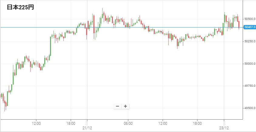 先週金曜に日銀が政策金利を発表し予想通り0.25%の利上げだったものの、その後の植田総裁の会見では来年以降の利上げに対し慎重な姿勢が示され円安が進行した。円安の進行を受けて週明け22日の東京株式市場は堅調な展開となり、日経225平均は577円高の50,084円と寄り付き時から大台の50,000円を回復。寄り後も前場に大きく上昇し、50,500円台をつけて上昇幅が1,000円を超えた。だが後場になると50,400~500円付近で落ち着いた動きとなり、終値は895円高の50,402円だった。