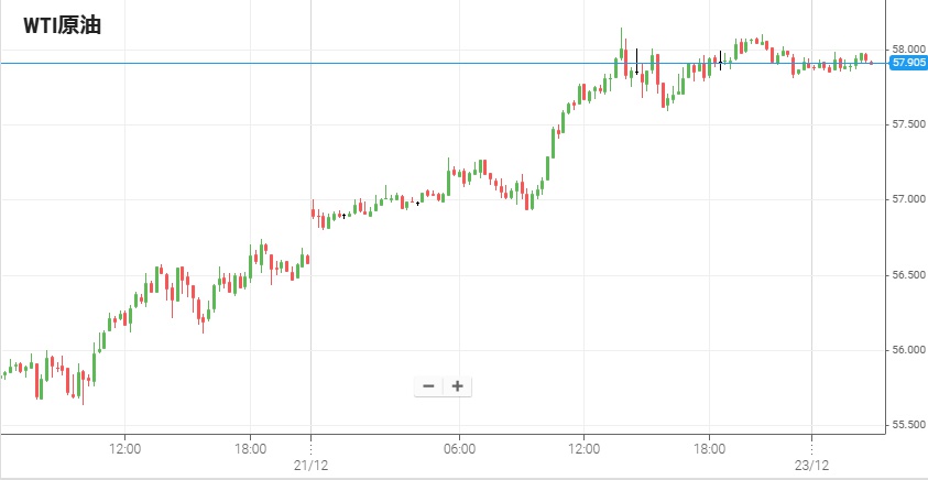 ロシアとウクライナの和平交渉の進展などから今月前半のNY原油は下げが続き、先週には一時55ドルをつけたが先週後半はやや反発して56.6ドルで19日を終えた。しかしすでに述べたように週末に米が2隻目のベネズエラタンカーを拿捕したことで産油国であるベネズエラとの緊張が高まり、それが週明けの原油相場にとって買い材料に。日中は57ドル付近で安定していたものの、夜になって買われて58ドルまで上昇。23日未明はそのまま58ドル付近に留まった。