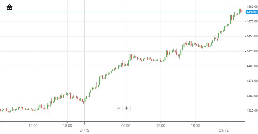 米とベネズエラ間の緊張の高まりは原油にとって買い材料となったと同時に、貴金属銘柄にとっても安全資産としての買い需要を高めた。先週を4,350ドルで終了したNY金は、週明け22日は午前中から上昇して10月につけた史上最高値の4,380ドルを更新した。正午過ぎに4,400ドルを超えたがそれでもまだ買いは止まらず、夜から23日未明にかけて上昇して23日午前中には4,500ドルに接近。10月の最高値を100ドル以上更新した。