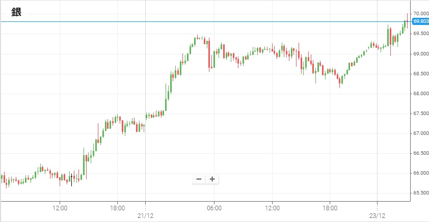 金価格の高騰がマスコミで広く報じられているが、銀もここ数週間~数ヶ月に高騰し最高値更新が続いている。先週金曜に最高値を更新して67ドルで終了したNY金は、22日は朝方から大きく上昇して69ドルを突破し連日の最高値更新。午後から夜にかけては69ドル付近で横ばいが続いたものの、23日未明になってまた買いが多く入り午前中には70ドルに接近している。