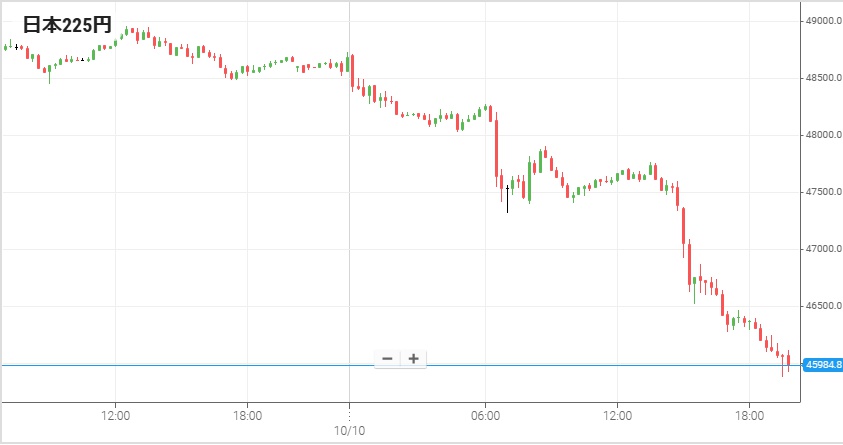 前日・9日の東証では日経225平均が846円上昇して48,580円で終了し、史上最高値を大幅に更新した。しかし公明党が連立から離脱するとの観測が高まり、10日は軟調な展開に。この日は70円安の48,510円で寄り付いた後、前場に大きく売られて数百円下落。後場になると一時48,000円を割りつつ491円安の48,088円で終了した。そして引け後に公明が正式に離脱を発表したことで日経225平均は数百円下落し、夜になってトランプ大統領が対中関税引き上げを発表するとさらに大きく下げて今週を終えた。