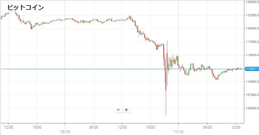 ビットコインは10日日中は特に材料がなく、1,860万円付近で夜まで小幅推移。しかし午後12時頃にトランプ大統領が対中追加関税を発表すると、リスク回避の売りは仮想通貨市場にも波及してその後数時間は大幅下落。特に11日午前6時過ぎには一気に100万円ほど下げて1,610万円をつけたが、これは先物などの強制決済が大量に出たためと見られている。このような下げは瞬間的であることが多く、すぐに1,700万円まで戻ってきた。(注:チャートは米ドル表記です)