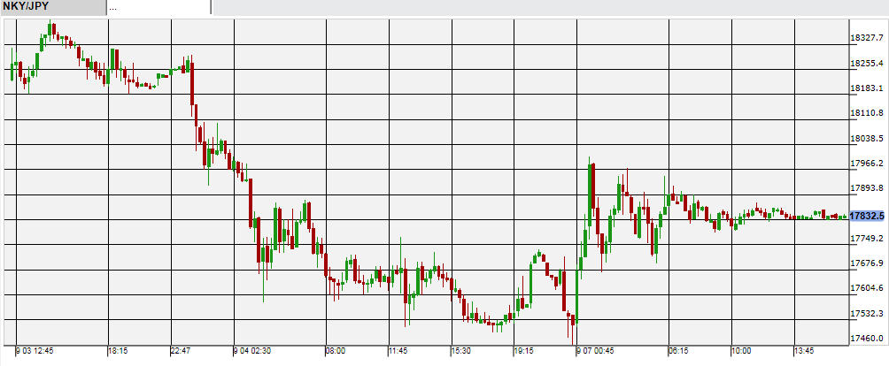先週金曜のNY株式市場が下げて終了したため、7日の国内株式市場は朝方に軟調。17,674円と前日より100円ほど安く寄り付いた後は、17,478円まで下げた。この水準は2月上旬以来約7ヶ月ぶりの安値となる。しかしそこから急激にリバウンドして18,000円台を回復しつつ、終値は68円高の17,860円だった。先物は米国市場が休場だったため夜以降あまり動かず、17,800円台のまま8日朝を迎えた。