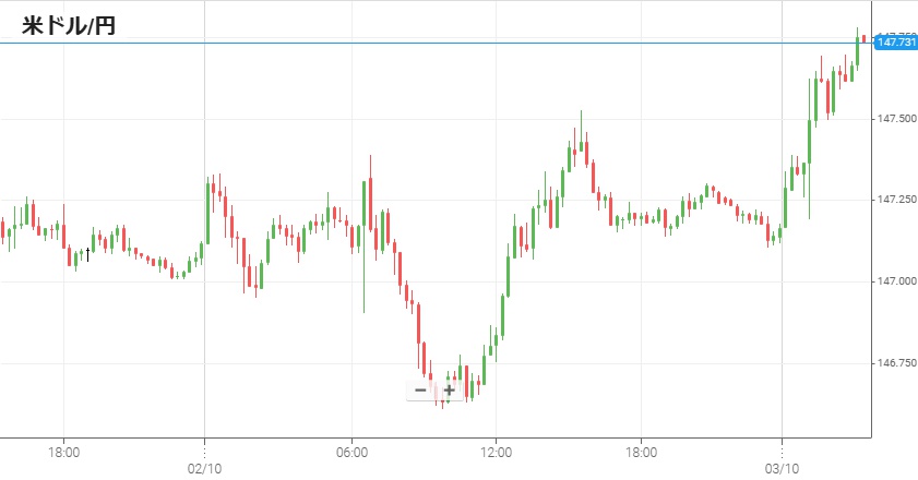 今週になってから米政府機関の閉鎖を材料として為替市場では円高・米ドル安が進行しており、1日夜には一時1ドル=146円台後半をつけた。だが2日朝方以降は円高も一服し、日中は147円~同30銭付近で推移。午後から夕方にかけて再度円高に動き146円台をつけたものの、数時間後に反発して147円台を回復。3日未明は再度147円台前半に留まった。