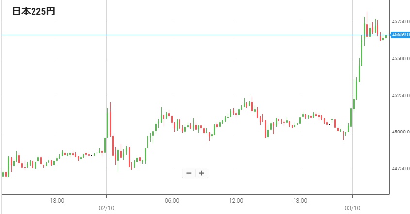 米政府機関の閉鎖懸念が高まったために1日の日経225平均382円安と下落。しかし同日のNYダウは43ドルの小幅高で終了し、為替市場も円高が一服したことから2日の東証はリバウンド相場に。日経225平均は186円高の44,736円で寄り付き、直後に数百円急上昇して45,000円を回復。高値を維持することはできず前場中に寄り値より低い水準まで下落したものの、後場になると再度上昇する不安定な動きが続いた末に終値は386円高の44,936円だった。