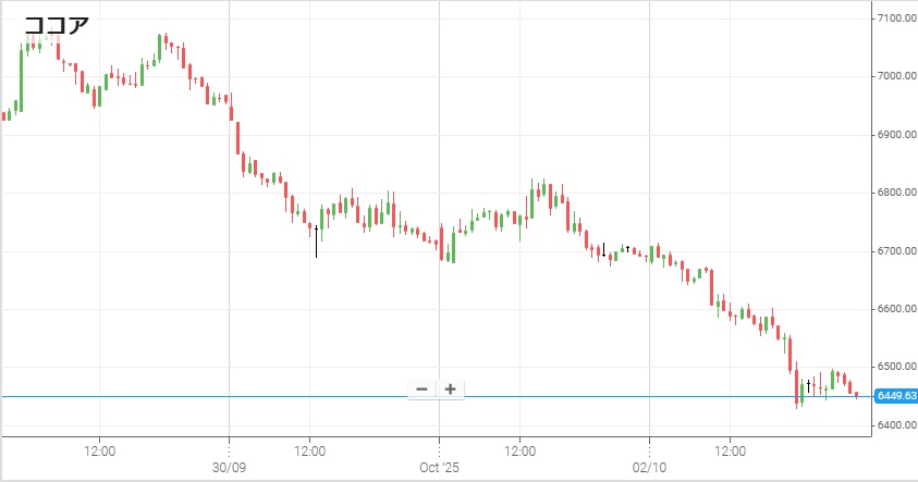 今年3月には11,000ドルまで上昇したNYココアだが、そこを天井にその後は長期的に下落。特に8月後半以降は下げ足を速めている。そして今週になって、西アフリカの生産国であるガーナとコートジボワールで、政府がカカオ豆農家への補助金を増額するとの情報が流れた。これが今後の供給増加見通しにつながり、2日のNY先物市場では序盤から大幅下落。一時は約1年半ぶりの安値となる6,420ドルをつけた。