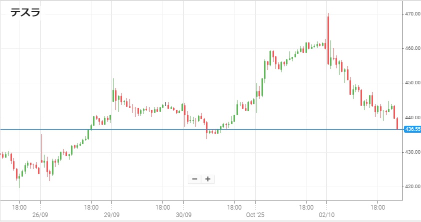 テスラが2日のNY株式市場開始前に7~9月の世界販売台数を発表し、前年同期比7%増だった。しかしこれは米政府による税制優遇措置廃止前の駆け込み購入と見られ、今後の販売台数減少懸念が高まった。前日を459.46ドルで終了したテスラ株は、2日は開始直後に一瞬だけプラス圏に浮上したがその後は序盤から終盤まで一貫して下落。5.1%安の436ドルで終了した。