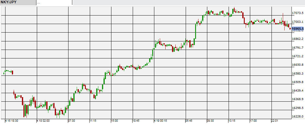 前日は熊本地震の影響などから572円安と暴落した日経225平均だったが、19日になって大幅リバウンド。16,582円と前日比約300円高で寄り付いた直後にさらに上昇し16,800円台に。その後も終日16,800円台を中心に推移し、終値は599円高の16,874円だった。夕方以降の先物の時間になると円安や欧米株高を受けて日経225先物がさらに買われ、17,000円台をつけつつ20日朝を迎えた。