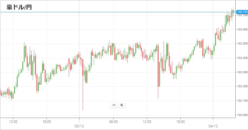 3日午前9時半に豪第3四半期GDPが発表され、予想の前年同期比2.2%増に対し発表は2.1%増と予想を下回った。発表前には1豪ドル=102円40銭だった豪ドル/円は、予想を下回るGDPを受けて一旦102円近くまで下落。だが下げは一瞬で終わり午前11時頃までには発表前の水準に戻り、その後は午後から夜まで主に102円40~50銭の狭いレンジ内で推移。4日朝方にはレンジを上方ブレークして上昇した。