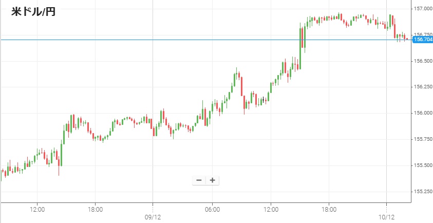 今週のFOMCで利下げ、来週の日銀会合で利上げの見通しが高まっているにも関わらず、基本的な円安基調は解消されていない。9日朝方には1ドル=155円80銭付近だった米ドル/円は、米長期金利高などを材料に日中から円安・米ドル高が進行。そして午後12時には米10月JOLTS求人件数が発表され、予想の715万件を上回る767万件だった。この統計を受けて157円近くまで米ドルが上昇し、10日未明は156円90銭付近に留まった。