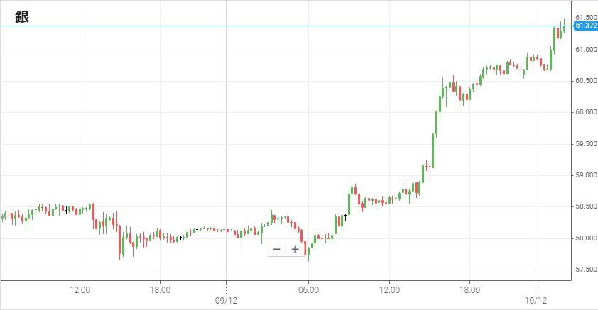今年後半に入ってからFRBの利下げ継続再開見通しや米ドルなどへの不安を受け、金価格が高騰している。そして注目度は金より低いが、同じ貴金属銘柄である銀や白金(プラチナ)も同様に高騰している。9日日中は58ドル付近で推移していたNY銀は、夕方過ぎに小幅上昇。そして米雇用指標が発表された午後12時頃に急騰し、史上初めて60ドルを突破した。その後も上げは止まらず10日午前中には61ドルを超えて上昇している。