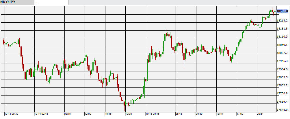 前日NY株式市場が下げたことを受け、15日の日経225平均は17,804円と安く寄り付いてスタート。しかし景気が弱含みしているため日銀の追加緩和期待が広がり、それを受け場中に大きく上昇。引けは前日比205円高の18,096円だった。夕方以降の先物の時間になると、為替市場では円高がやや進行したがNY株式市場が上昇したため、日経225先物は18,200円台を回復した。