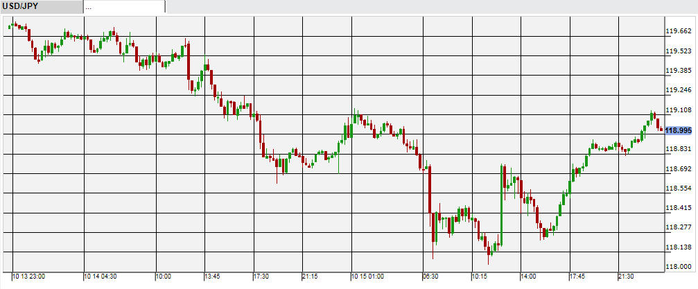 ユーロ/円のように15日午前から午後にかけて119円付近で小幅に推移していた米ドル/円だが、午後4時前後のECB追加緩和示唆発言によって、米ドル/円も同様に円高に。118円近くまで下げ、3月以来7ヶ月破られなかった118円台半ばのサポートラインを一瞬割ることとなった。ただし8月24日のパニック的な売りで一瞬だけ115円台まで下がったこともあった。夜に発表された米経済指標がまずまずだったこともあり、夜以降円安に反転。