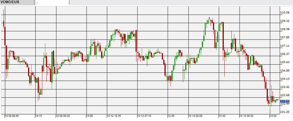 排ガス規制逃れのため該当車をリコールする問題で、ドイツ政府は不正が行われたディーゼル車・約240万台を強制的にリコールするようフォルクスワーゲンに命じた。また欧州全体で850万台をリコールするとも発表。この報を受け、ここ1~2週間はやや上昇に転じていたVW株は15日に下落。前日終値の106.6から3.6%安の102.8で終了した。