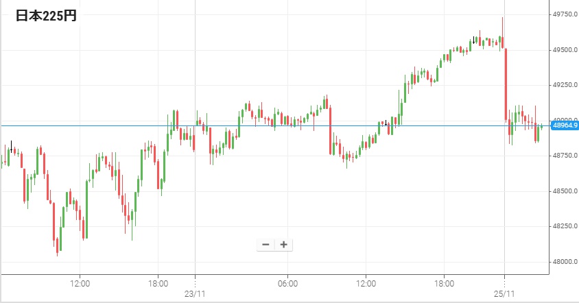 日本が振替休日で東証が休場していた24日だが、大阪やシカゴなどの日経225先物は取引が行われた。先週を49,000円付近で終えた先物は、24日の日中は原資産である指数に動きがないために大きく動かず夜まで49,000円を挟んで細かく上下。しかし夜以降のNY株式市場は堅調な動きとなったことから、先物も上昇して25日朝までに49,500円を超えたが25日の東証が始まると急落した。