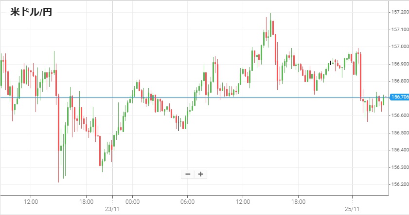 高市政権の政策への期待と懸念から総理就任以降は急激な円安が進行している。先週には一時1ドル=157円台後半まで円安になったが、終盤にやや円高に動き156円40銭で先週を終了した。そして週明け24日は先週の終値とほぼ同じ水準から始まり、日中は緩やかに円安が進行して夜には一旦157円を回復した。だがFRBのウォラー理事が追加利下げを支持する発言をしたことなどから、そこで円安は止まり25日未明は156円90銭付近で横ばいが続いた。
