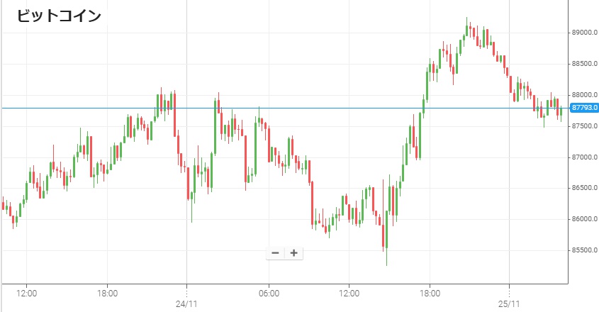 ビットコインは先週金曜に海外DEXのHyperliquidで急落したことなどをきっかけに下落し、一時は4月以来となる1,200万円台をつけた。他の金融市場が取引を休止する22日土曜には1,320万円付近に留まっていたものの、23日日曜になると緩やかに上昇し、24日月曜は1,350~1,370万円のレンジで推移。25日未明になると急騰して一時は1,400万円に接近した。(注:チャートは米ドル表記です)