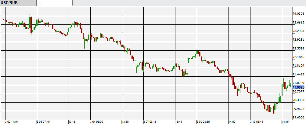 原油価格が先月以降上昇に転じているため、ロシア・ルーブルも上昇している。1月には1米ドル=83ルーブルまで下落し2014年12月の通貨危機の再来とも思われたロシアだが、その後はルーブルが反騰。3月10日には70ルーブルを割って69ルーブル台になった。ルーブルの1米ドル=69ルーブル台は、昨年12月末以来2ヶ月半ぶりとなる。